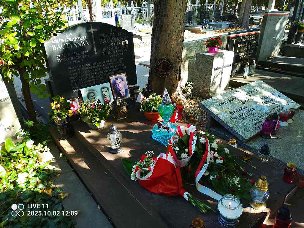 Byliśmy również na Powązkach Wojskowych, gdzie złożyliśmy kwiaty i złapaliśmy znicze na grobach bohaterów lektury ,,Kamienie na szaniec”, grobie poety czasów wojennej zagłady – Krzysztofa Kamila Baczyńskiego oraz mogile patrona naszej szkoły- Władysława Broniewskiego.