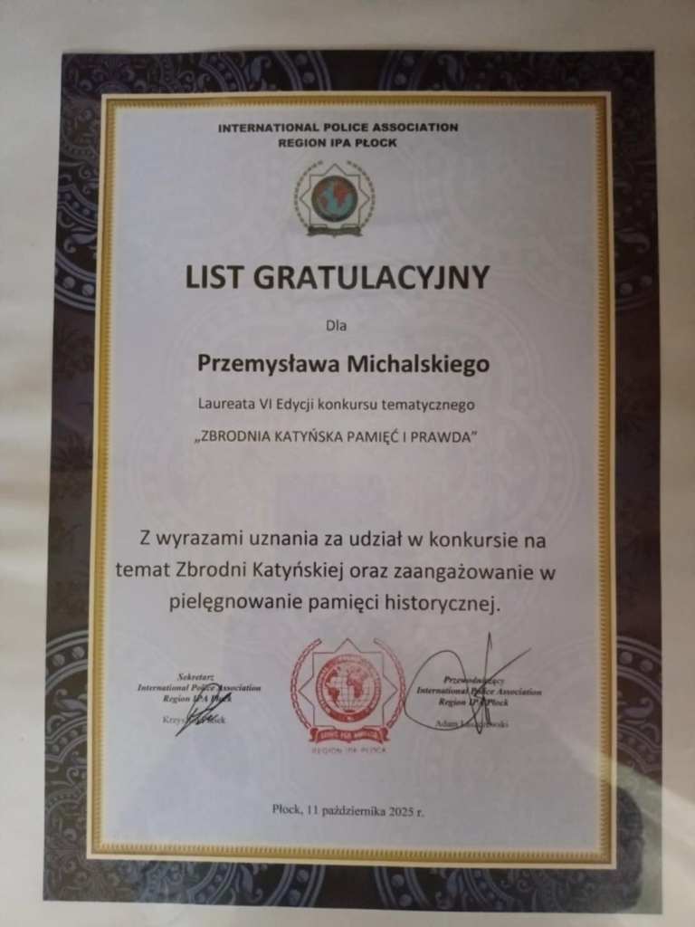 W trakcie konferencji uczeń klasy 8a Przemysław Michalski otrzymał z rąk organizatorów list gratulacyjny wraz z upominkami jako wyraz uznania dla osiągnięcia tytułu laureata VI edycji konkursu tematycznego „Zbrodnia Katyńska. Pamięć i Prawda” oraz podziękowania za zaangażowanie w pielęgnowaniu pamięci historycznej.