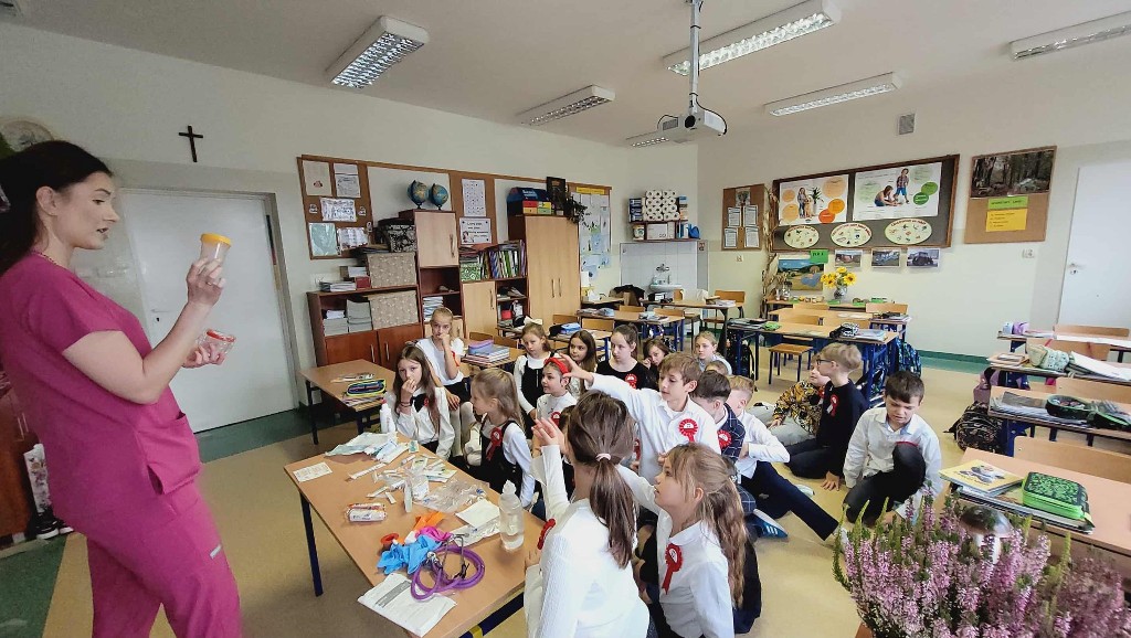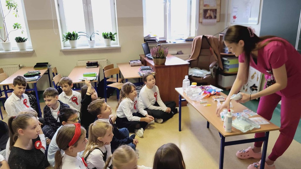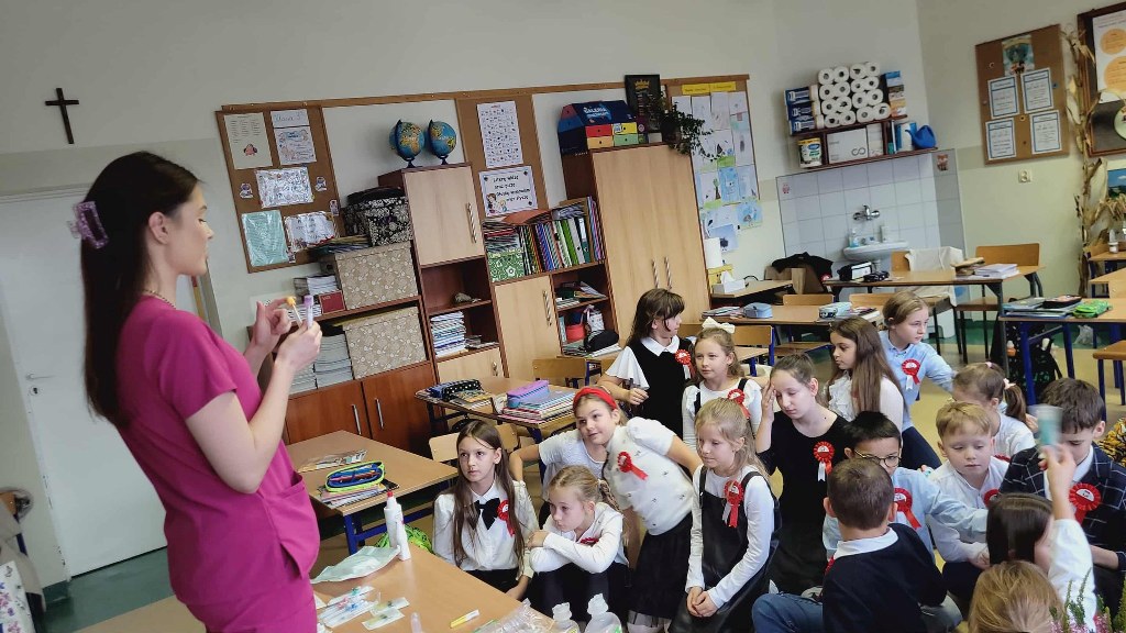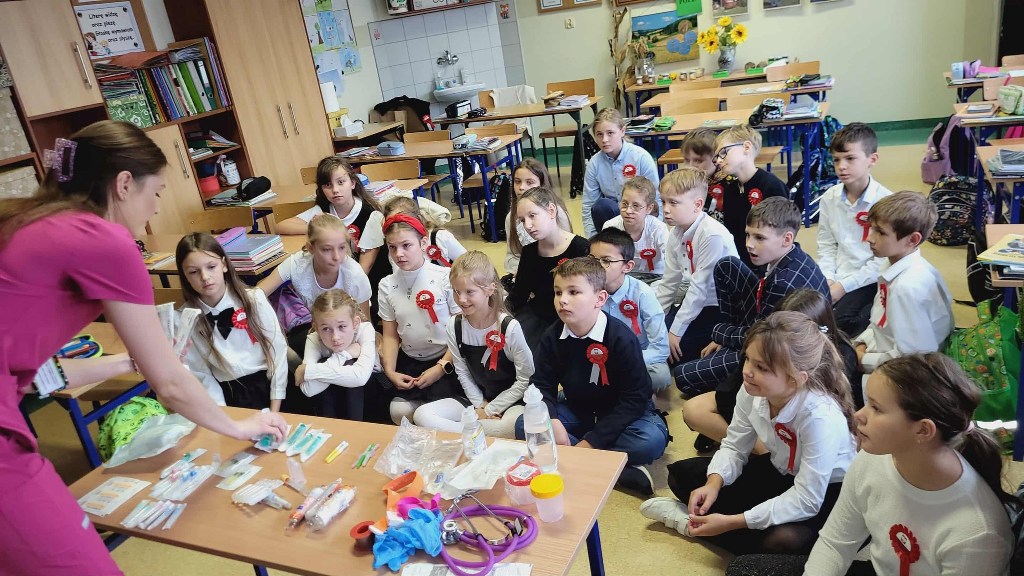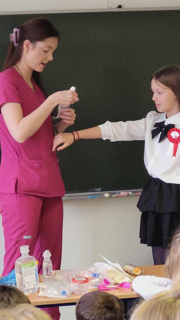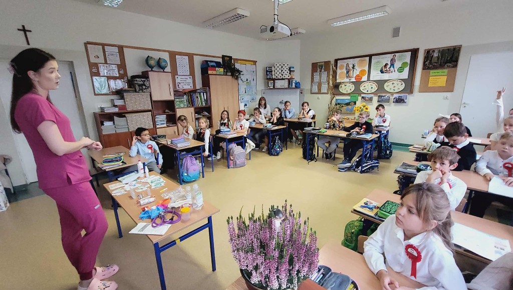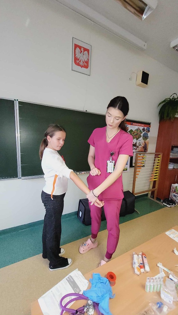 Zajęcia rozpoczęły się od zapoznania uczniów z zawodem pielęgniarki. Pani Aida ciekawie opowiadała o swojej pracy w szpitalu. Dzieci dowiedziały się, jak bardzo odpowiedzialna jest to praca i jak długo trzeba się uczyć, by móc zajmować się chorymi.