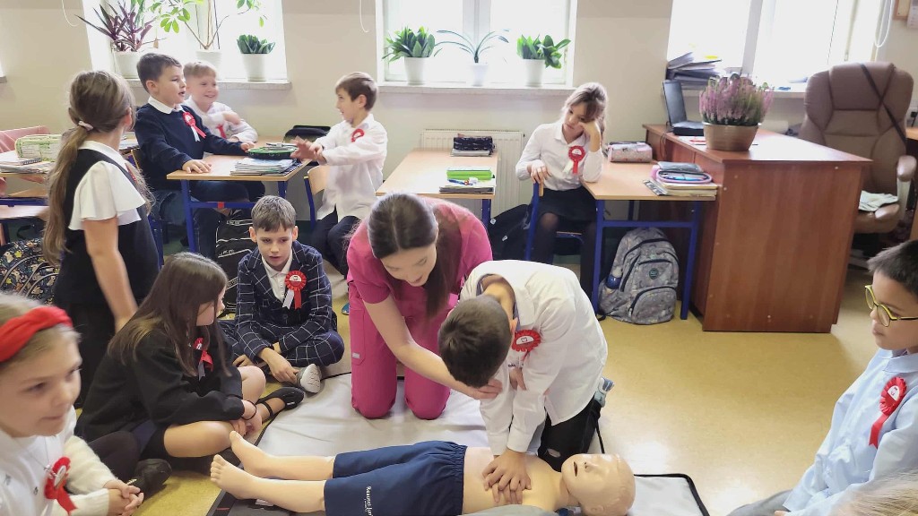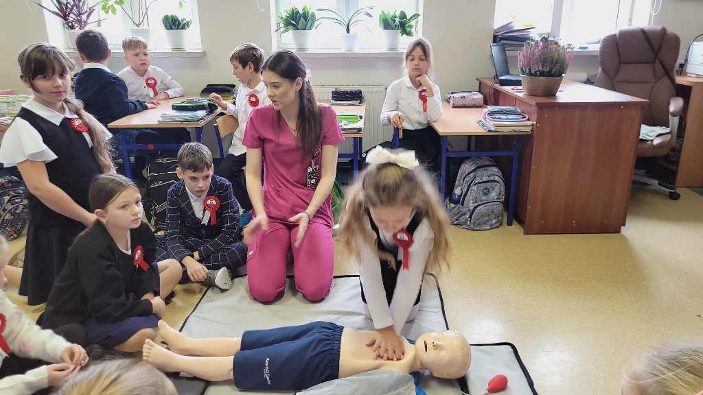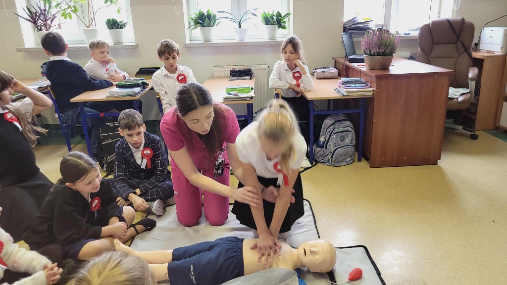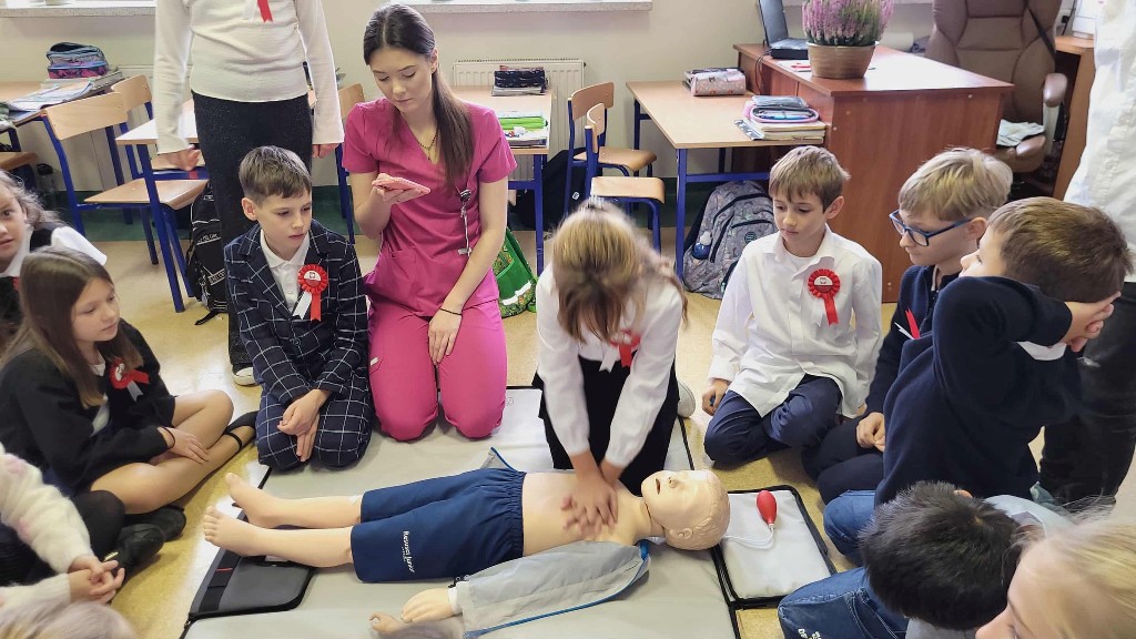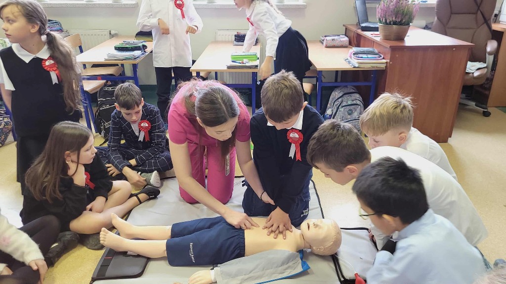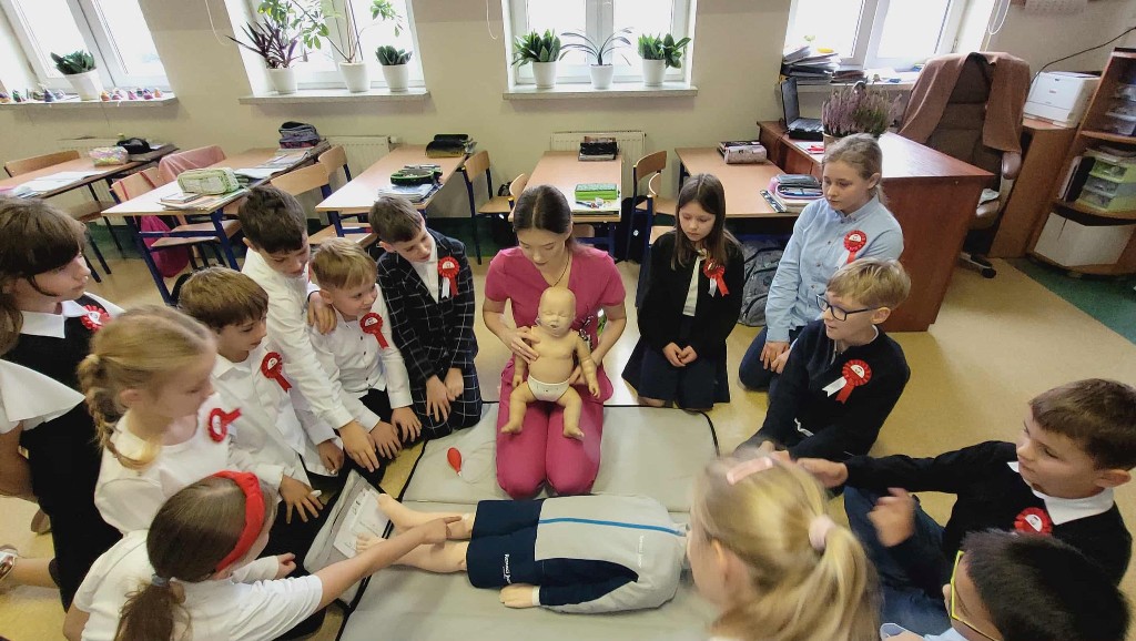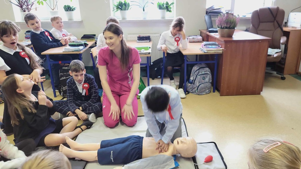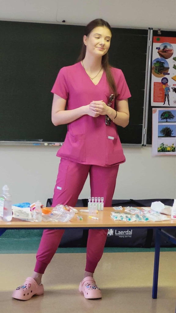 Zajęcia rozpoczęły się od zapoznania uczniów z zawodem pielęgniarki. Pani Aida ciekawie opowiadała o swojej pracy w szpitalu. Dzieci dowiedziały się, jak bardzo odpowiedzialna jest to praca i jak długo trzeba się uczyć, by móc zajmować się chorymi.