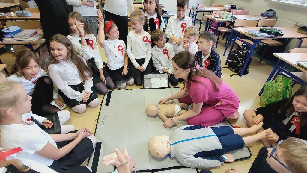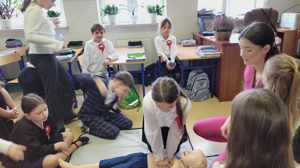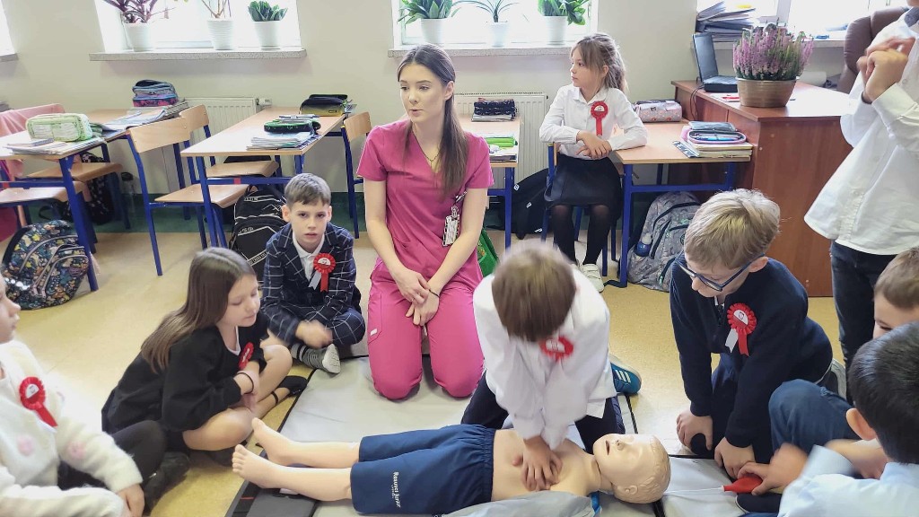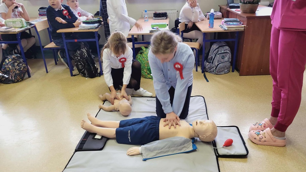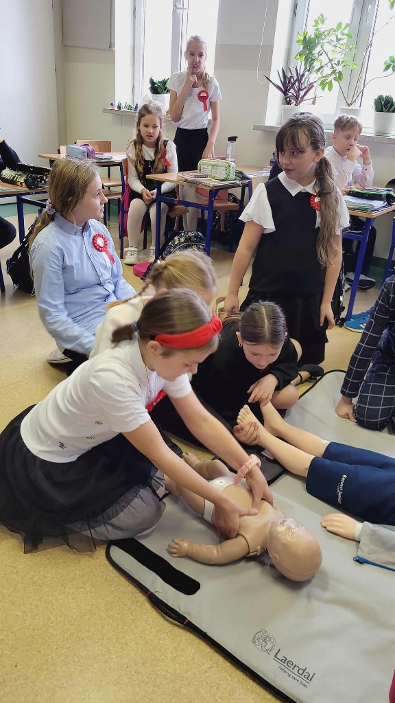 Uczniowie zadawali ciekawe pytania związane pracą w tym zawodzie. Ważnym elementem spotkania była nauka pierwszej pomocy. Uczniowie bardzo chętnie uczestniczyli w ćwiczeniach praktycznych.