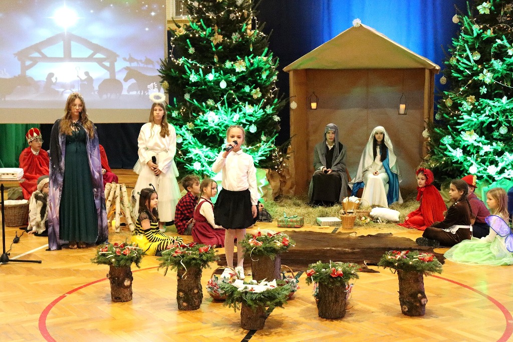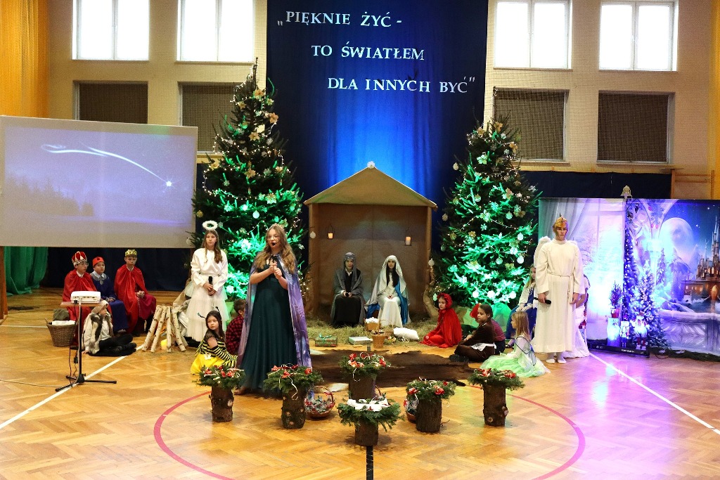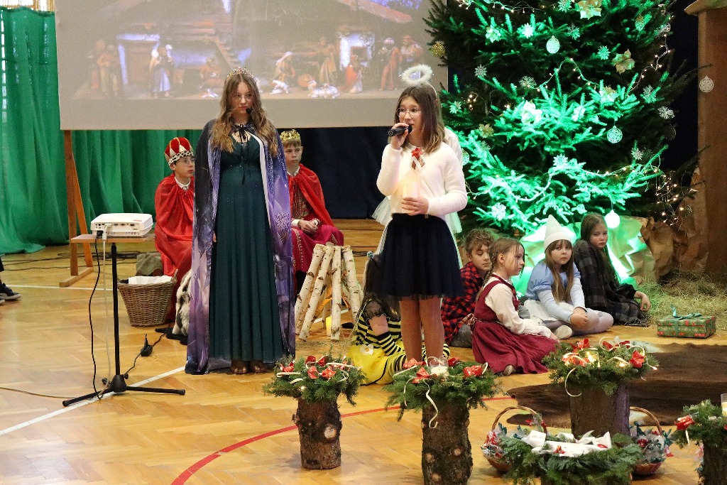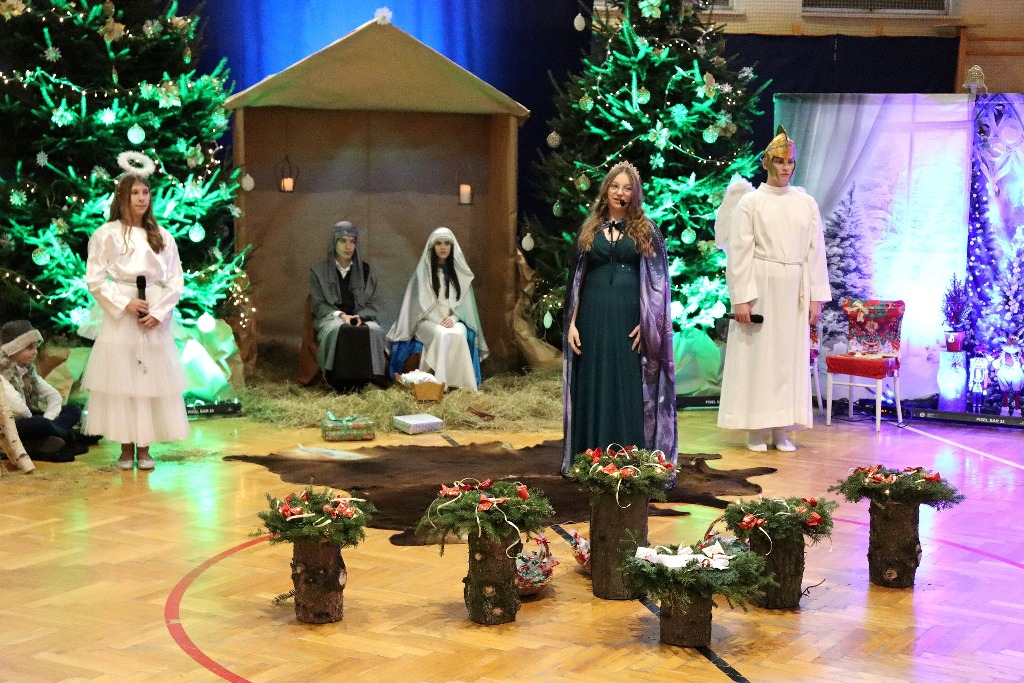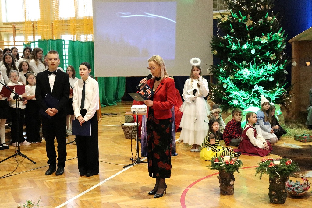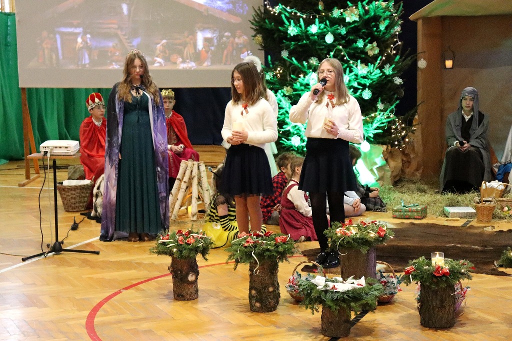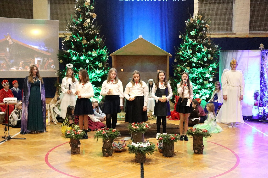 Wydarzenie rozpoczęło się od uroczystego powitania gości przez panią dyrektor Marię Kluge. Scenariusz tegorocznych jasełek, można powiedzieć, był trójwymiarowy, opierał się na tradycyjnych motywach biblijnych, historycznym przyjściu Jezusa w Betlejem.