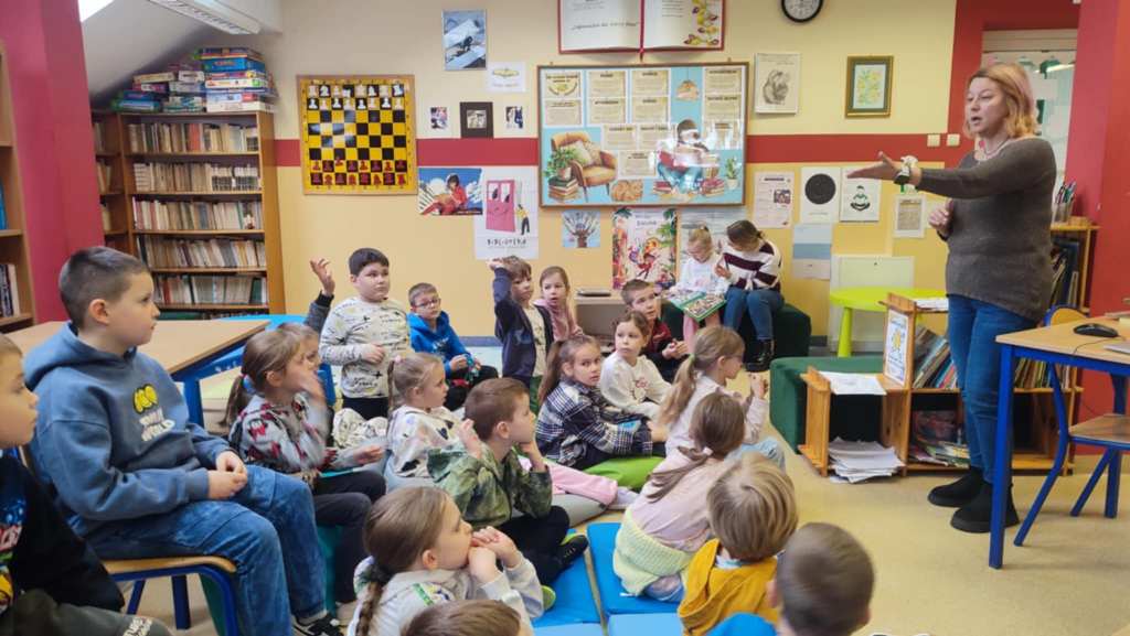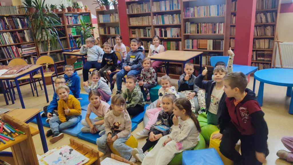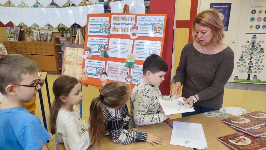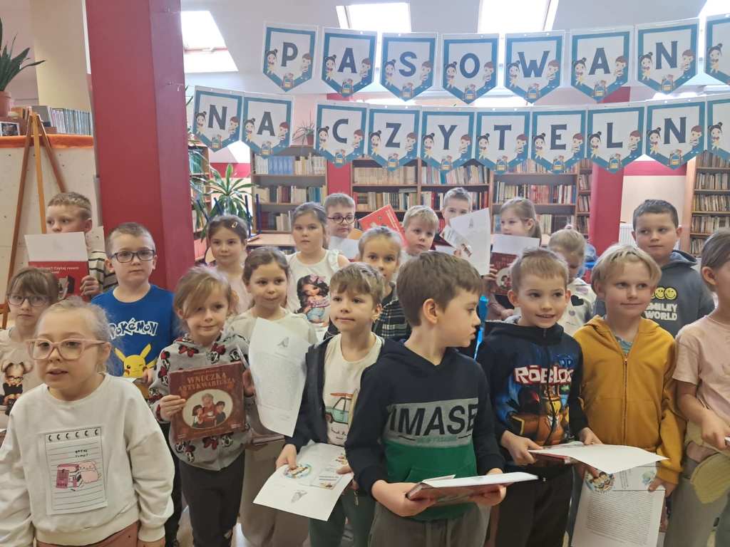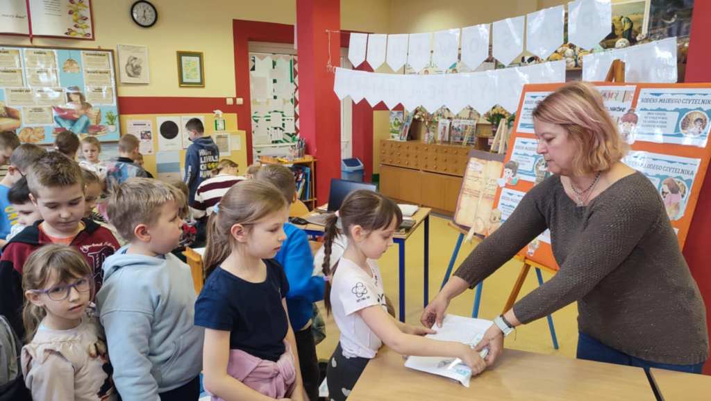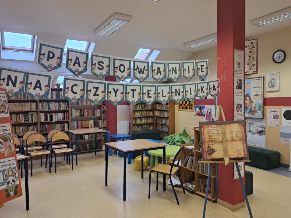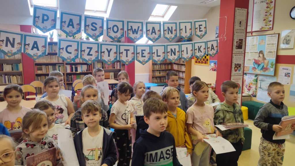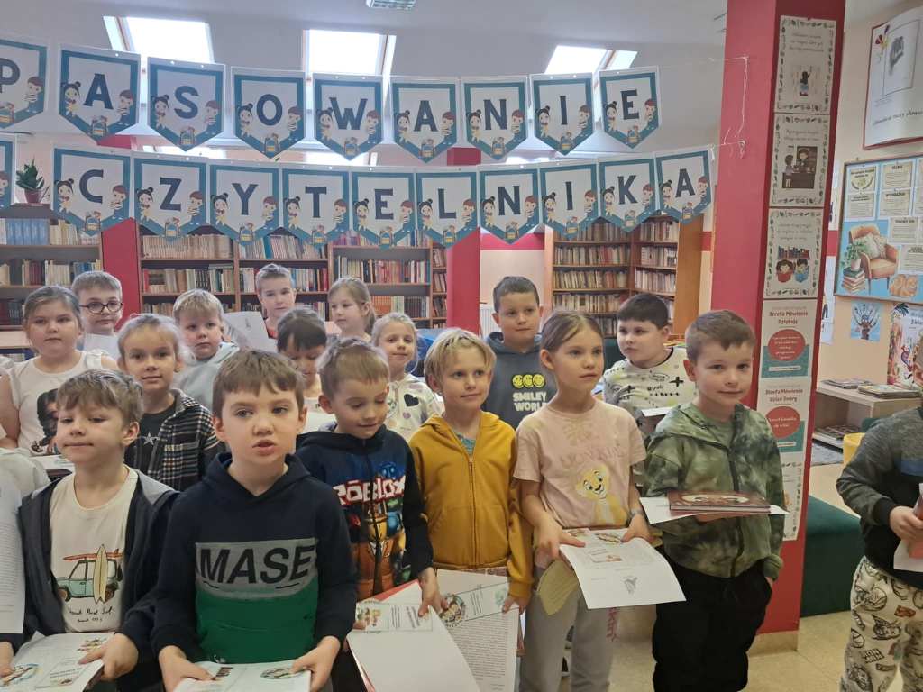 Dnia 15 stycznia 2026 roku odbyło się pasowanie na czytelnika uczniów klas Ia i Ib. Pasowanie na czytelnika to oficjalne przyjęcie do grona czytelników biblioteki. Spotkanie zaczęło się od pogadanki, z której uczniowie dowiedzieli się, dlaczego warto czytać książki, zapoznali się z księgozbiorem przeznaczonym dla najmłodszych czytelników, regulaminem biblioteki, sposobem wypożyczania książek, zasadami zachowania w bibliotece i postępowania z książkami. Oglądając przygotowaną prezentację multimedialną, uczniowie poznali proces powstawania książek i nazwy osób (zawodów) z tym związanych. W czasie spotkania pierwszoklasiści sprawdzili również swoją znajomość popularnych baśni, odgadując ich tytuły z prezentowanych ilustracji i przedmiotów z nimi związanych. Na pamiątkę uroczystego wydarzenia bibliotekarka wręczyła każdemu z nowo pasowanych czytelników drobny upominek w postaci pamiątkowego medalu, zakładki, listu do rodziców zachęcającego do czytania dzieciom oraz książki „Wnuczka antykwariusza” Justyny Bednarek pozyskanej w ramach projektu „Mała książka – wielki człowiek” z Ministerstwa Kultury i Dziedzictwa Narodowego. W zestawie znalazł się także poradnik dla rodziców zachęcający do czytania dzieciom i z dziećmi.