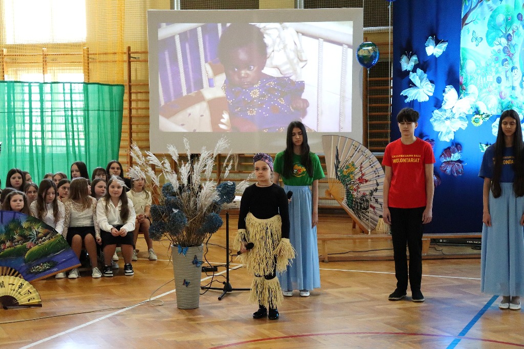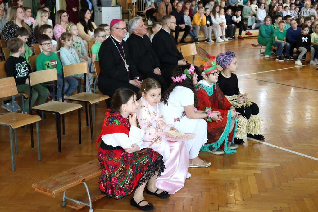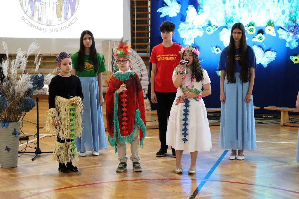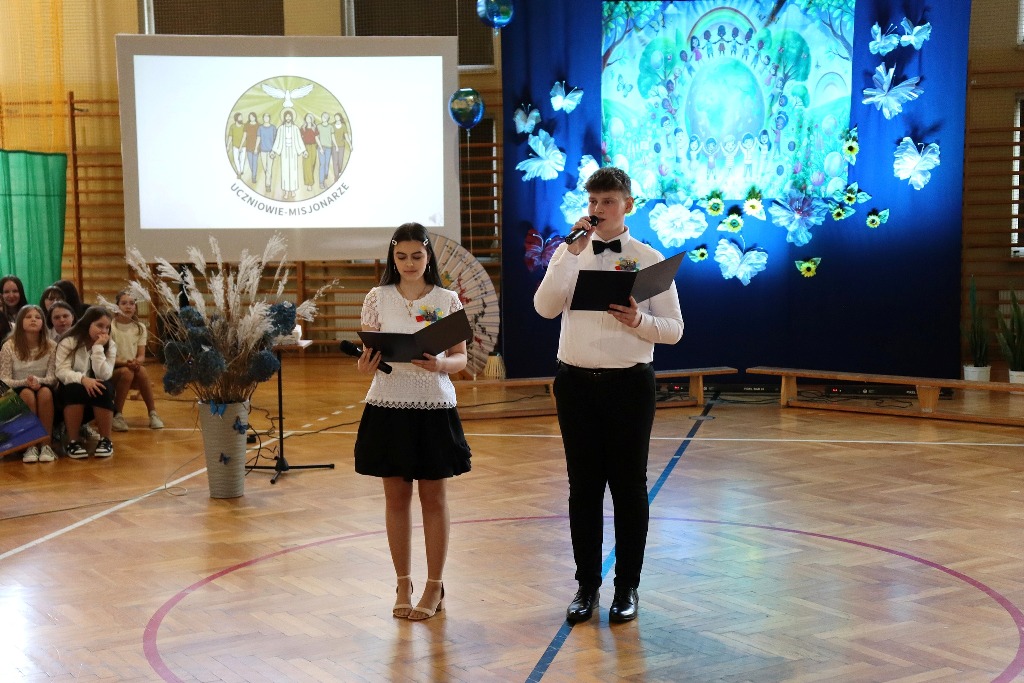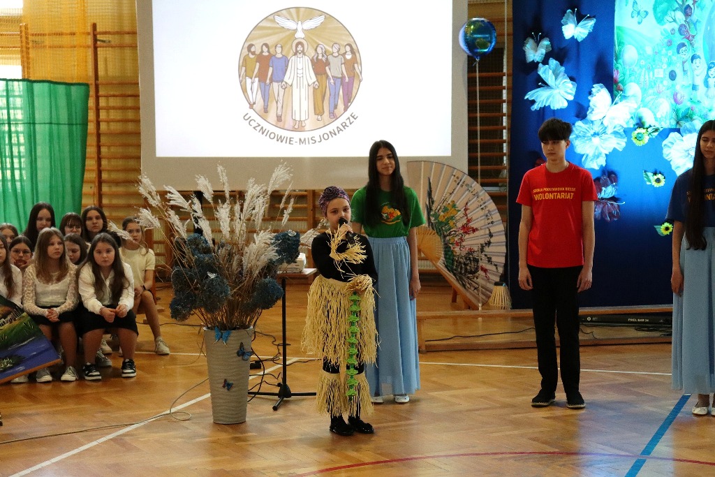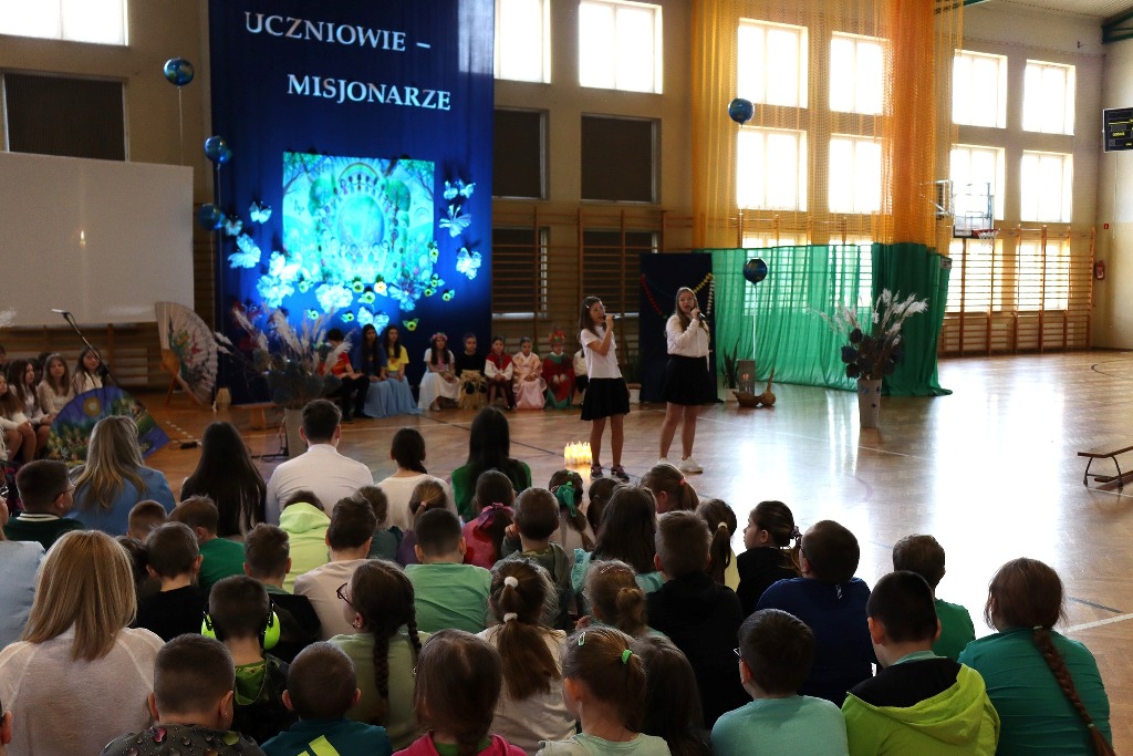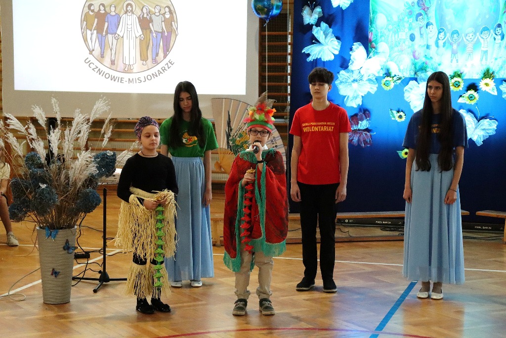 Uczniowie przygotowali z tej okazji montaż słowno – muzyczny, którego myślą przewodnią było hasło roku liturgicznego 2026 „Uczniowie – misjonarze”. Hasło ma na celu ukazanie, że każdy ochrzczony jest jednocześnie uczniem Jezusa i posłanym przez Niego misjonarzem, a formacja chrześcijańska jest warunkiem odnowy Kościoła i wzrostu duchowego wiernych. Mali aktorzy, przedstawiciele kontynentów: Afryki, Ameryki, Azji, Europy, Australii i Oceanii przybliżyli życie dzieci w różnych częściach świata. Starsze dzieci wcieliły się w przedstawicieli organizacji pomocowych takich jak: Wolontariat czy Papieskie Dzieło Misyjne Dzieci, ukazując, jak można realizować nakaz misyjny Pana Jezusa: „ Idźcie więc i nauczajcie wszystkie narody”. Występujący przybliżyli formy pomocy oraz pracy misyjnej. Dzieci położyły szczególny akcent na modlitwę – modlitwę żywego różańca, jak również znaczenie i symbolikę kolorów różańca misyjnego: białego, czerwonego, zielonego, niebieskiego i żółtego. Przedstawienie wzbogaciły filmy ukazujące życie na różnych kontynentach oraz muzyka regionalna, śpiew szkolnego chóru i występ solistek.