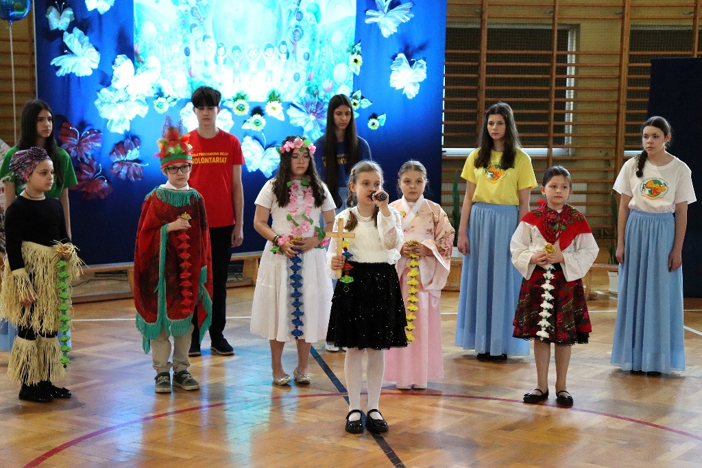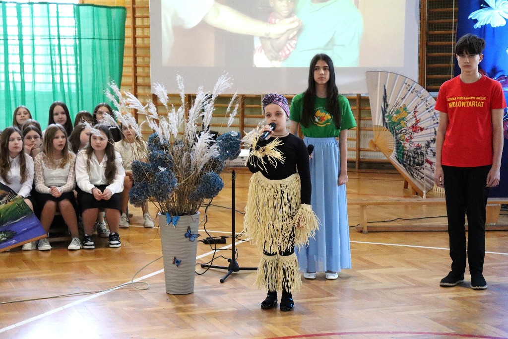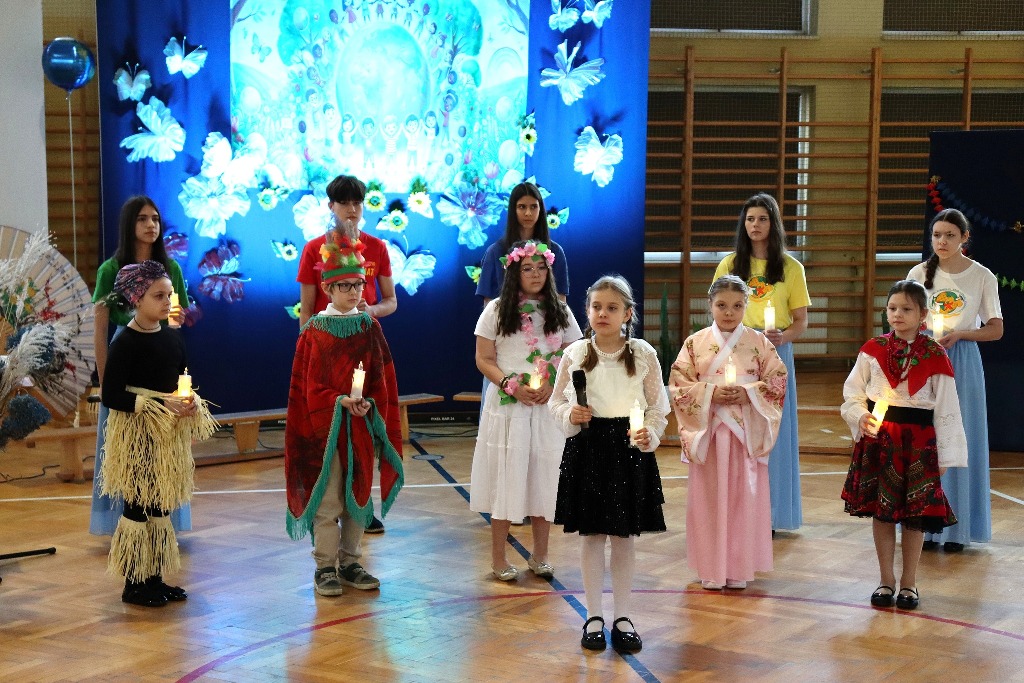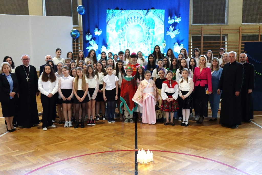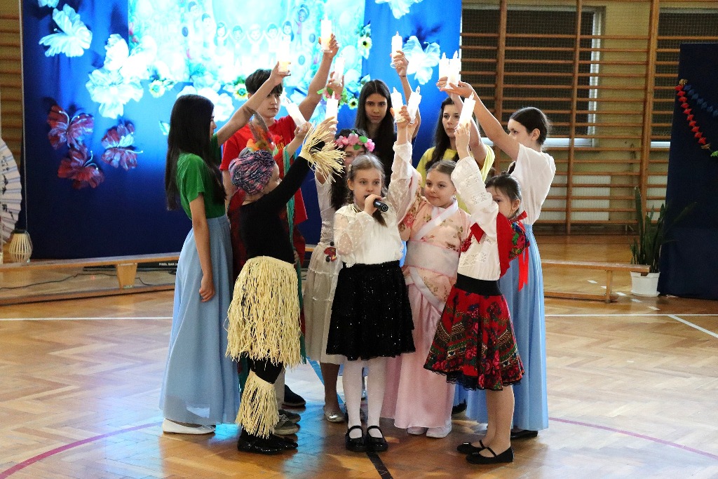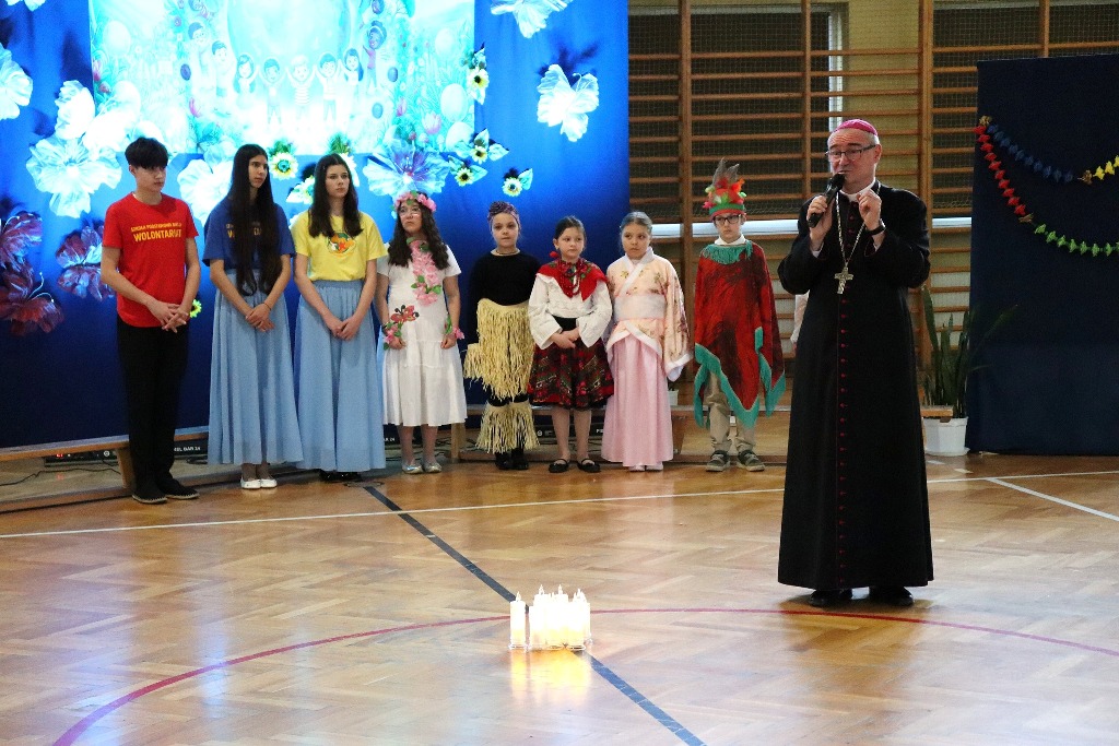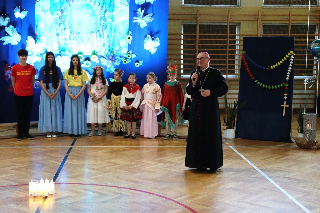 Uczniowie przygotowali z tej okazji montaż słowno – muzyczny, którego myślą przewodnią było hasło roku liturgicznego 2026 „Uczniowie – misjonarze”. Hasło ma na celu ukazanie, że każdy ochrzczony jest jednocześnie uczniem Jezusa i posłanym przez Niego misjonarzem, a formacja chrześcijańska jest warunkiem odnowy Kościoła i wzrostu duchowego wiernych. Mali aktorzy, przedstawiciele kontynentów: Afryki, Ameryki, Azji, Europy, Australii i Oceanii przybliżyli życie dzieci w różnych częściach świata. Starsze dzieci wcieliły się w przedstawicieli organizacji pomocowych takich jak: Wolontariat czy Papieskie Dzieło Misyjne Dzieci, ukazując, jak można realizować nakaz misyjny Pana Jezusa: „ Idźcie więc i nauczajcie wszystkie narody”. Występujący przybliżyli formy pomocy oraz pracy misyjnej. Dzieci położyły szczególny akcent na modlitwę – modlitwę żywego różańca, jak również znaczenie i symbolikę kolorów różańca misyjnego: białego, czerwonego, zielonego, niebieskiego i żółtego. Przedstawienie wzbogaciły filmy ukazujące życie na różnych kontynentach oraz muzyka regionalna, śpiew szkolnego chóru i występ solistek.