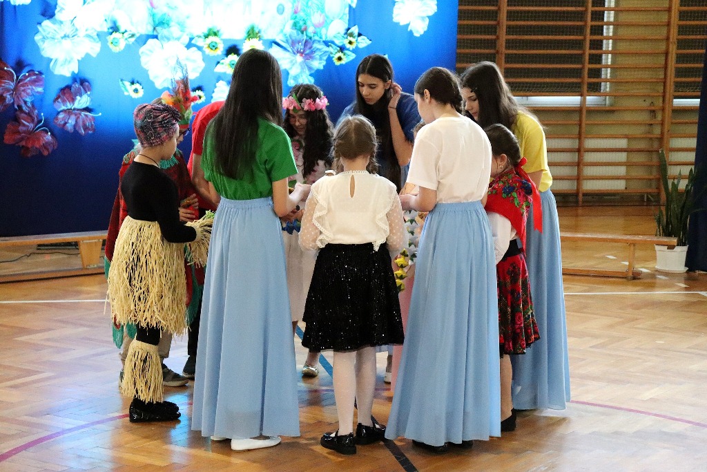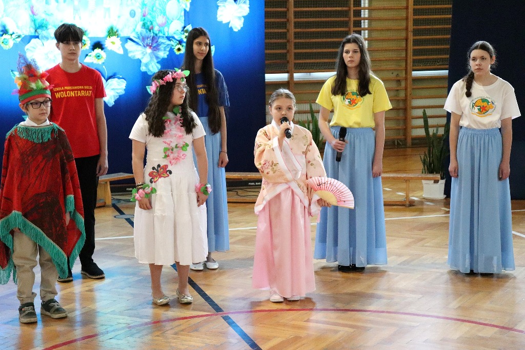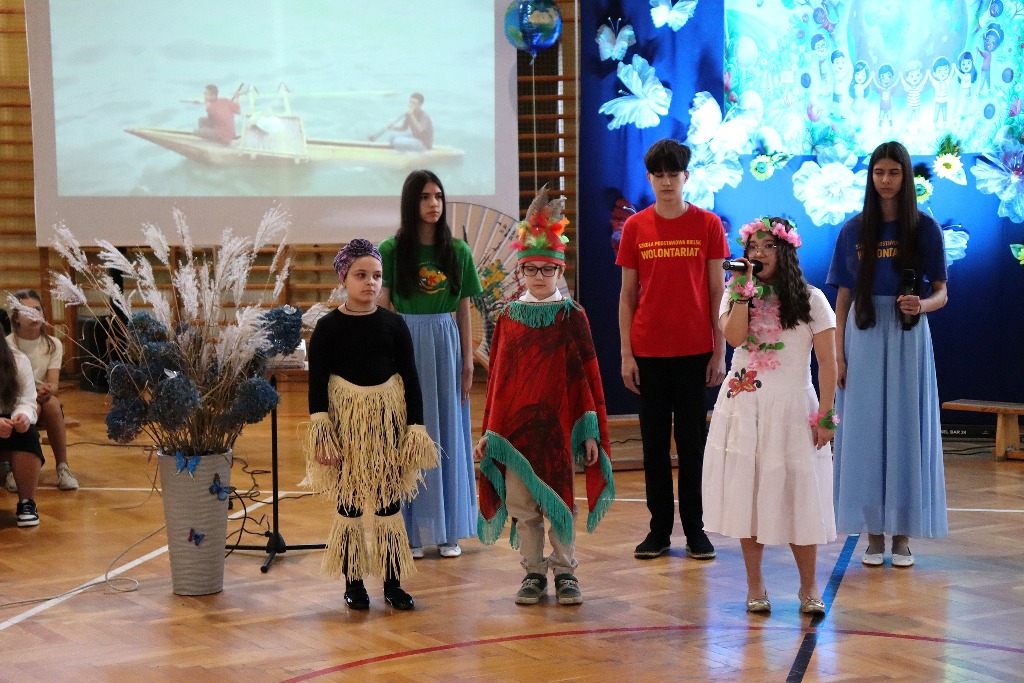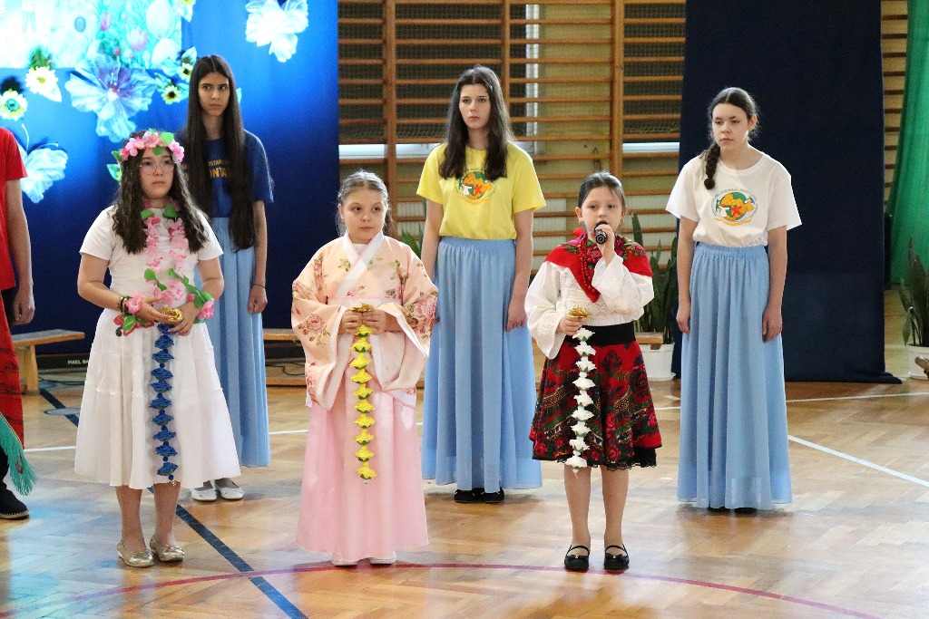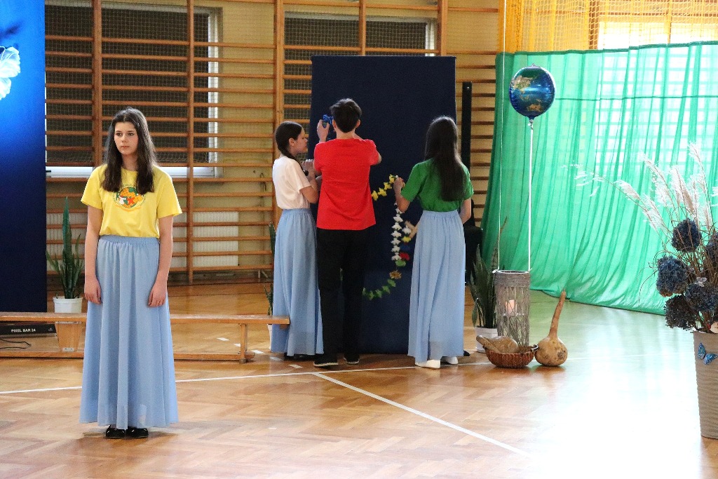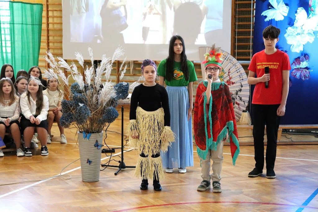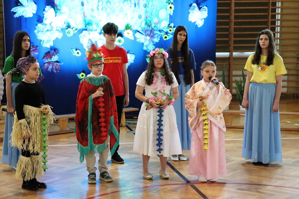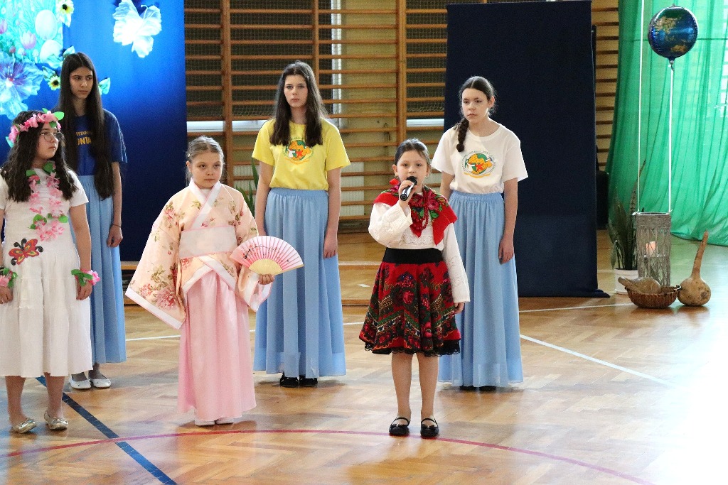 Uczniowie przygotowali z tej okazji montaż słowno – muzyczny, którego myślą przewodnią było hasło roku liturgicznego 2026 „Uczniowie – misjonarze”. Hasło ma na celu ukazanie, że każdy ochrzczony jest jednocześnie uczniem Jezusa i posłanym przez Niego misjonarzem, a formacja chrześcijańska jest warunkiem odnowy Kościoła i wzrostu duchowego wiernych. Mali aktorzy, przedstawiciele kontynentów: Afryki, Ameryki, Azji, Europy, Australii i Oceanii przybliżyli życie dzieci w różnych częściach świata. Starsze dzieci wcieliły się w przedstawicieli organizacji pomocowych takich jak: Wolontariat czy Papieskie Dzieło Misyjne Dzieci, ukazując, jak można realizować nakaz misyjny Pana Jezusa: „ Idźcie więc i nauczajcie wszystkie narody”. Występujący przybliżyli formy pomocy oraz pracy misyjnej. Dzieci położyły szczególny akcent na modlitwę – modlitwę żywego różańca, jak również znaczenie i symbolikę kolorów różańca misyjnego: białego, czerwonego, zielonego, niebieskiego i żółtego. Przedstawienie wzbogaciły filmy ukazujące życie na różnych kontynentach oraz muzyka regionalna, śpiew szkolnego chóru i występ solistek.