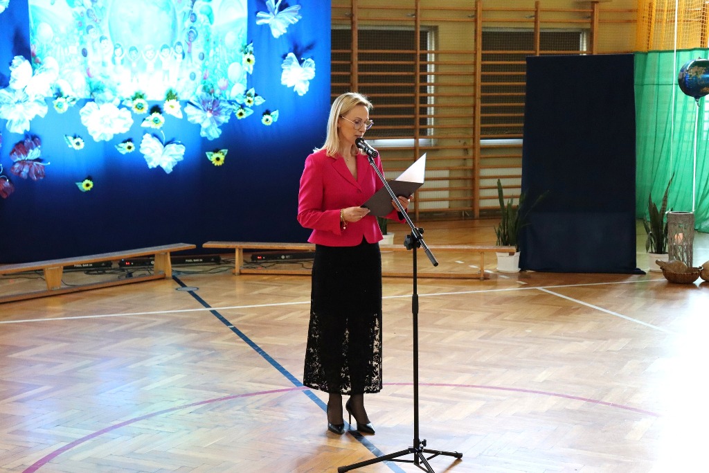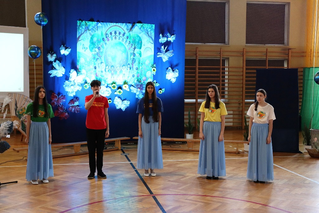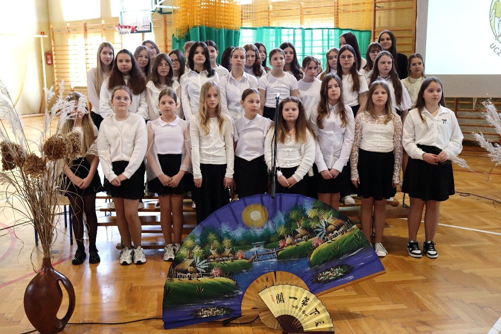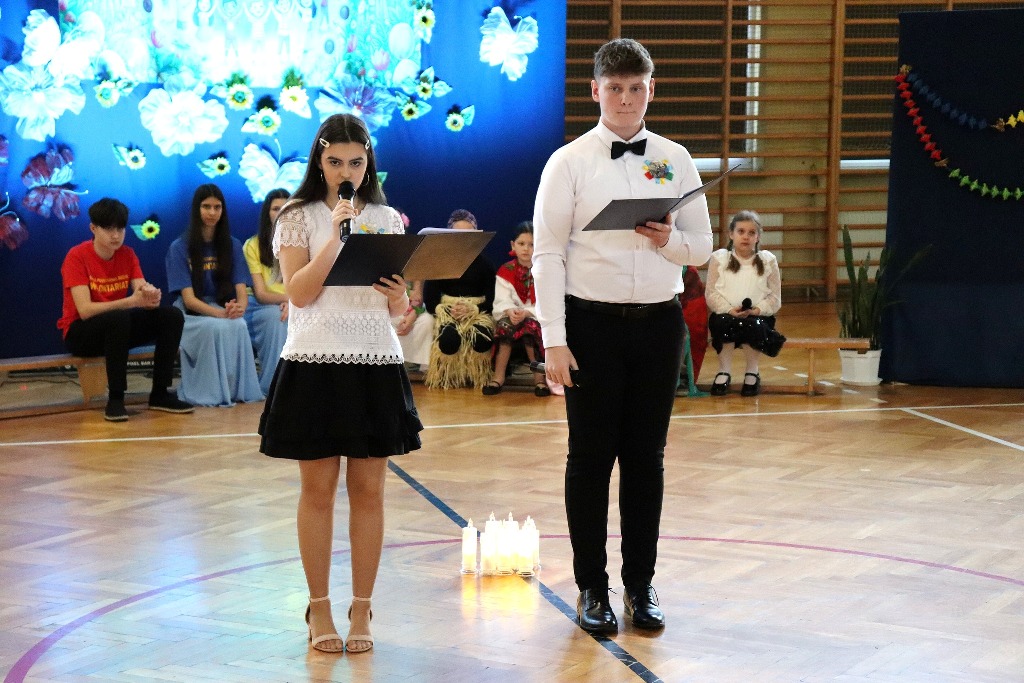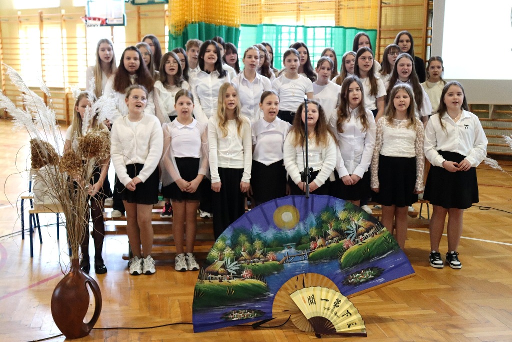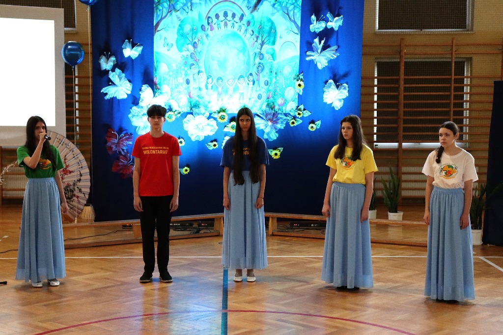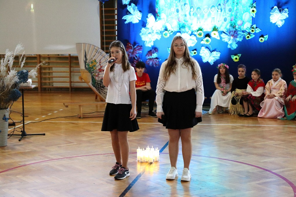 Uczniowie przygotowali z tej okazji montaż słowno – muzyczny, którego myślą przewodnią było hasło roku liturgicznego 2026 „Uczniowie – misjonarze”. Hasło ma na celu ukazanie, że każdy ochrzczony jest jednocześnie uczniem Jezusa i posłanym przez Niego misjonarzem, a formacja chrześcijańska jest warunkiem odnowy Kościoła i wzrostu duchowego wiernych. Mali aktorzy, przedstawiciele kontynentów: Afryki, Ameryki, Azji, Europy, Australii i Oceanii przybliżyli życie dzieci w różnych częściach świata. Starsze dzieci wcieliły się w przedstawicieli organizacji pomocowych takich jak: Wolontariat czy Papieskie Dzieło Misyjne Dzieci, ukazując, jak można realizować nakaz misyjny Pana Jezusa: „ Idźcie więc i nauczajcie wszystkie narody”. Występujący przybliżyli formy pomocy oraz pracy misyjnej. Dzieci położyły szczególny akcent na modlitwę – modlitwę żywego różańca, jak również znaczenie i symbolikę kolorów różańca misyjnego: białego, czerwonego, zielonego, niebieskiego i żółtego. Przedstawienie wzbogaciły filmy ukazujące życie na różnych kontynentach oraz muzyka regionalna, śpiew szkolnego chóru i występ solistek.