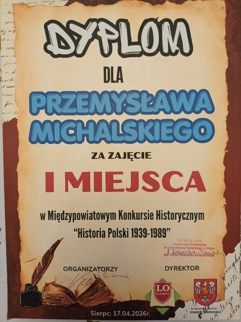 1 miejsce i tytuł laureata Międzypowiatowego Konkursu Historycznego „Polska w latach 1939 – 1989” uzyskał Przemysław Michalski z klasy 8a! Warto podkreślić, iż Przemek zwyciężył w konkursie organizowanym przez LO w Sierpcu po raz trzeci, co zostało podkreślone przez organizatorów podczas wręczania nagród!